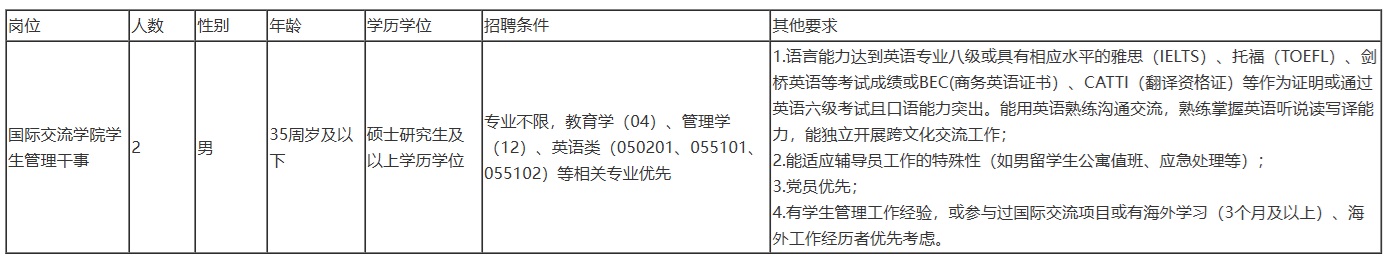 1.负责留学生日常生活管理,能够完成男留学生公寓值班工作,生活关怀,纪律监督学业指导等工作;