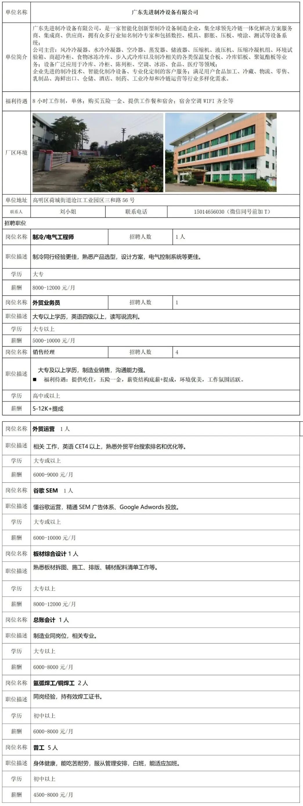广东先进制冷设备有限公司招聘