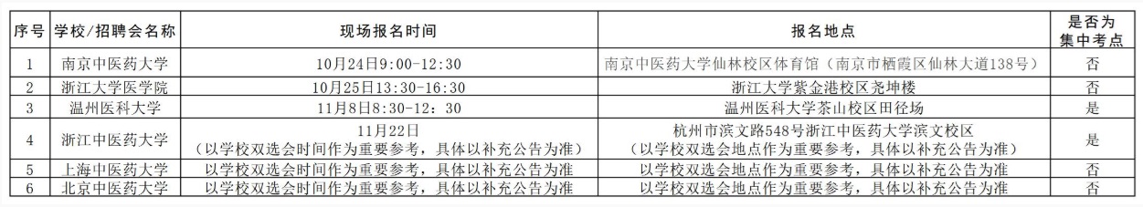 本次招聘设有集中考点和非集中考点。集中考点涉及接收报名材料、现场资格确认、安排初试、复试等相关环节;非集中考点仅涉及接收报名材料、现场资格确认等相关环节,不涉及初试、复试等环节。本次招聘将在温州医科大学和浙江中医药大学双选会场次设置集中考点,在其余场次设置非集中考点。温州医科大学集中考点招聘结束后,将适时公布拟签订就业协议对象名单,按实核减相关岗位并以补充公告形式予以公布浙江中医药大学集中考点场次招聘岗位信息。若所有岗位在温州医科大学集中考点招聘中均已有拟签订就业协议对象,则浙江中医药大学集中考点场次不再开考。请各有关考生自行关注考点选择。