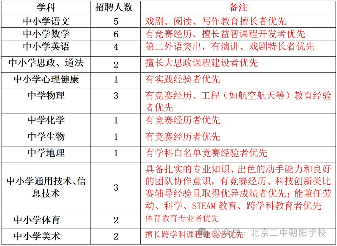 北京市第二中学朝阳学校是朝阳区教委引进优质教育资源北京市第二中学合作创办的一所公立十二年建制学校。学校秉承“空气养人”的办学理念和“涵育童心”的育人方略,共享集团优质资源,聚力“三基”课程开发和“三生”课堂打造,促进学生全面、个性和可持续发展,办学质量持续提升,赢得了“家门口的好学校”的良好口碑。根据小、初、高办学规模同步发展需求,现面向全国公开招聘小学、初中、高中各学科优秀教师。招聘需求及相关要求如下: