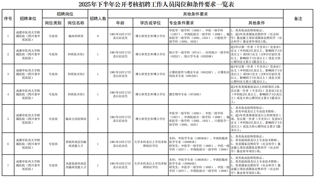 原标题:成都中医药大学附属医院(四川省中医医院)2025年下半年公开考核招聘工作人员公告