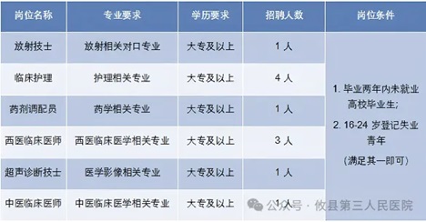 身份要求:离校 2 年内未就业的医学类高校毕业生、16-24 岁登记失业青年(注:以上均要求第一学历为全日制大专及以上)