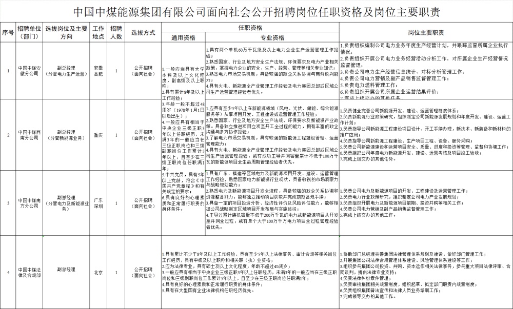 4.中国中煤能源集团有限公司法律及合规部副总经理1名,工作地点:北京市。