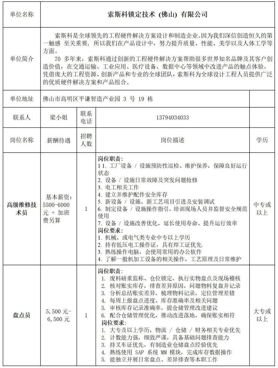 索斯科锁定技术 (佛山) 有限公司招聘