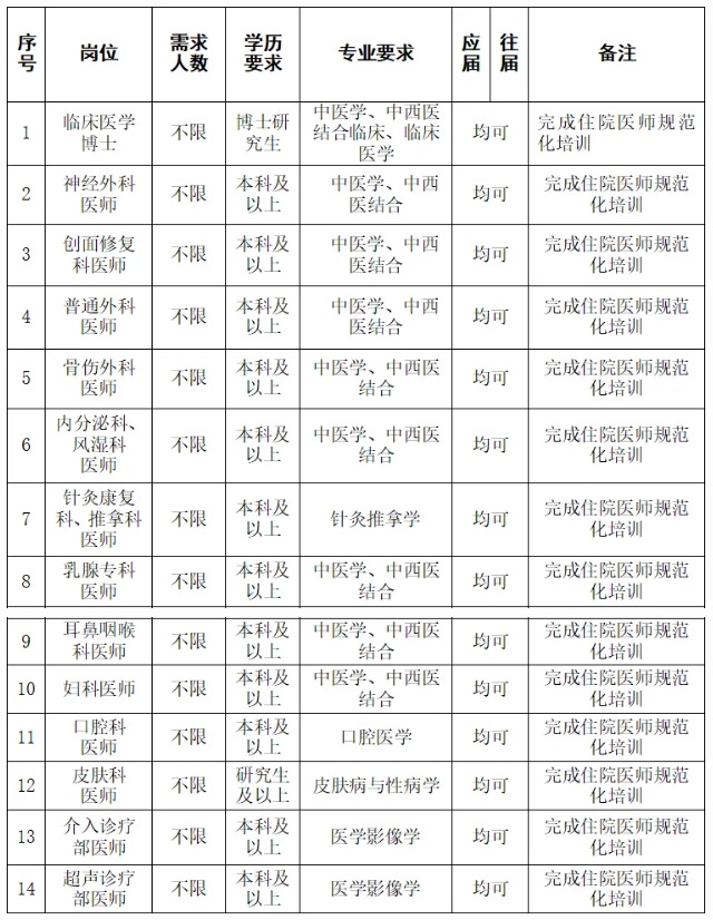 5. 年龄要求:硕士研究生学历,年龄≤40周岁(1985年12月1日以后出生);非应届本科学历,年龄≤35周岁(1990年12月1日以后出生),具有三甲医院工作经历,高级职称特别优秀年龄可适当放宽。