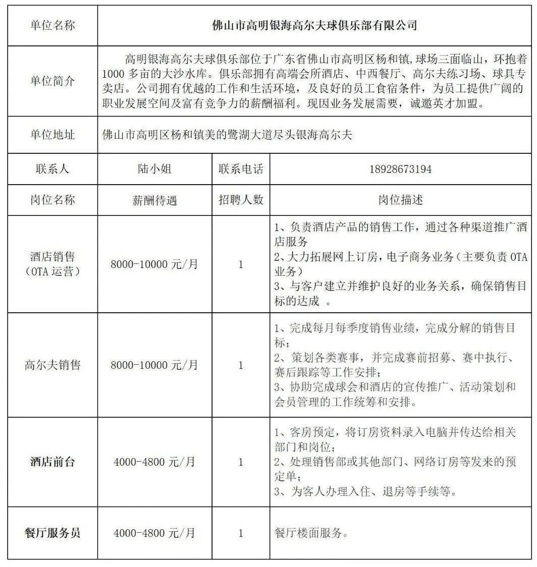 佛山市高明银海高尔夫球俱乐部有限公司招聘