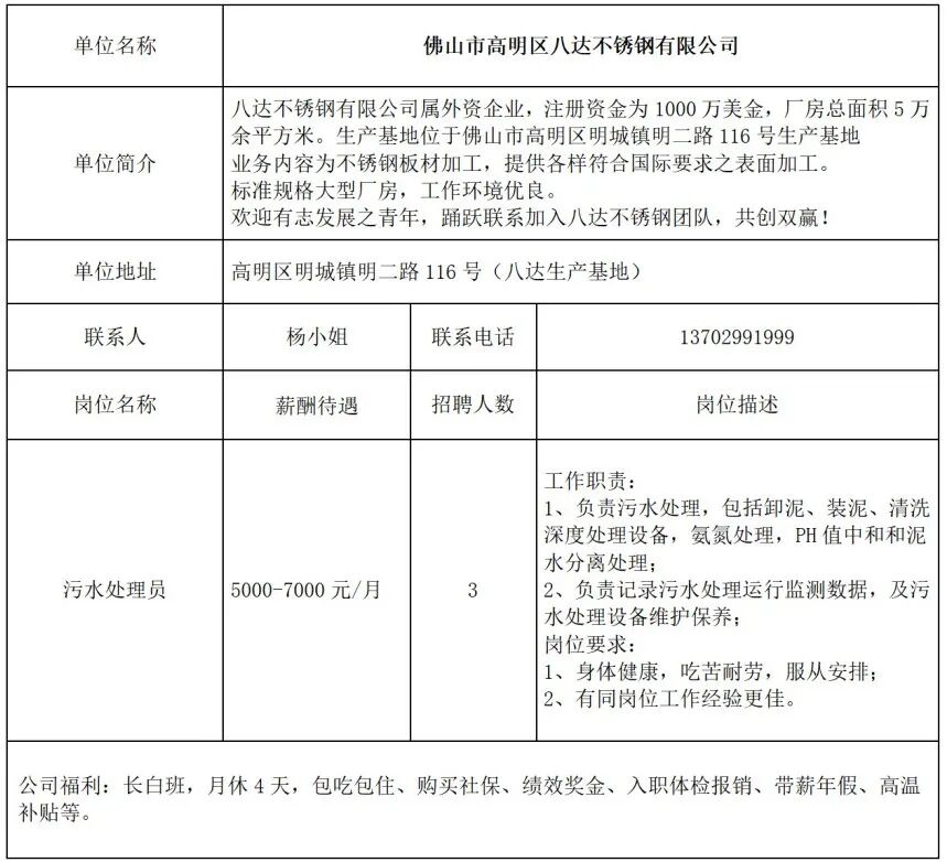 佛山市高明区八达不锈钢有限公司招聘
