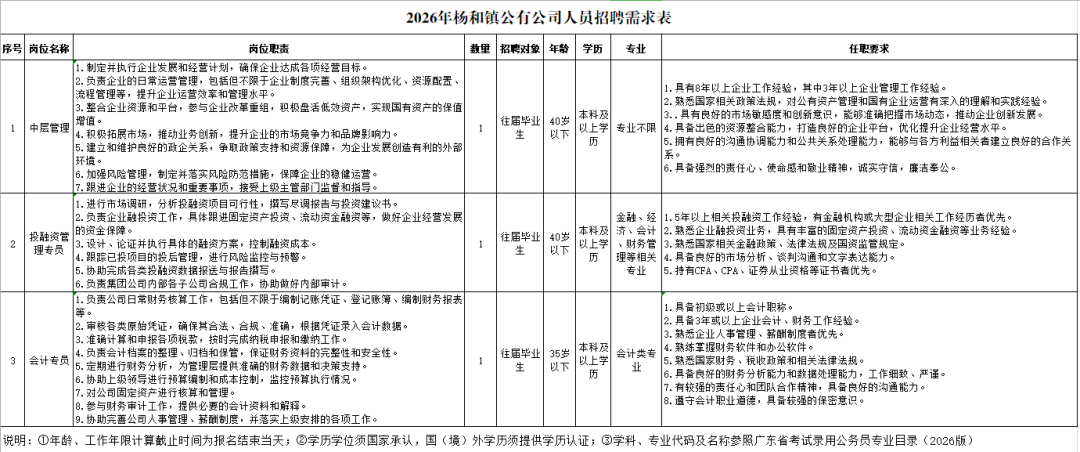 ◆详见附件《2026年杨和镇公有公司人员招聘需求表》。