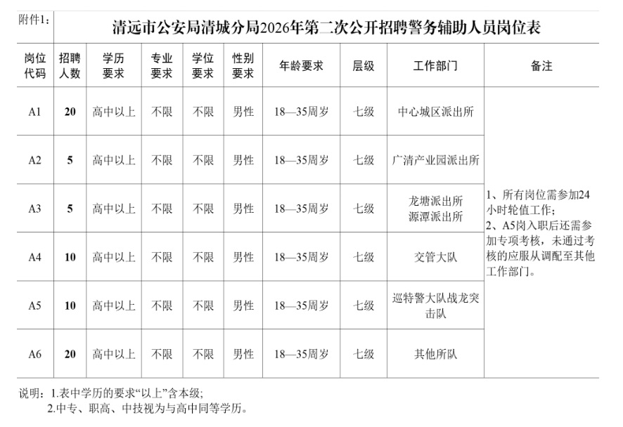 公告附件1:清远市公安局清城分局2026年第二次公开招聘警务辅助人员岗位表.xlsx