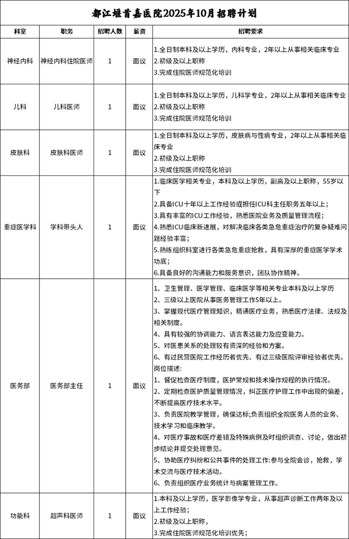 原标题:都江堰首嘉医院2025年10月招聘计划