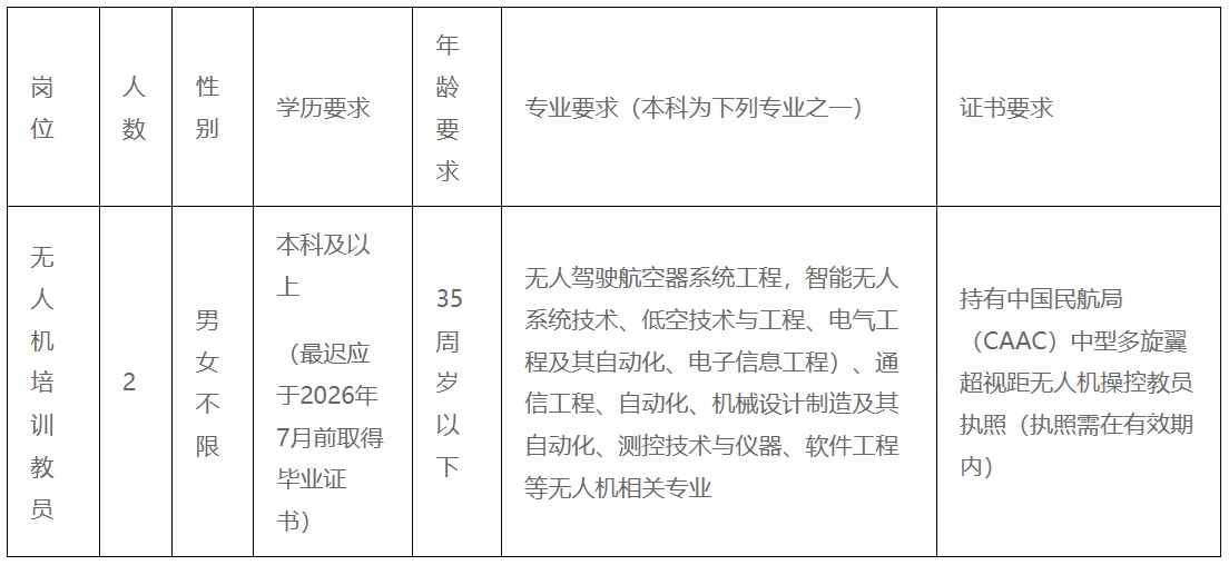 1.基本条件:本科及以上学历(最迟应于2026年7月前取得毕业证书),持有中国民航局(CAAC)中型多旋翼超视距无人机操控教员执照(执照需在有效期内),有多种机型教员执照优先;