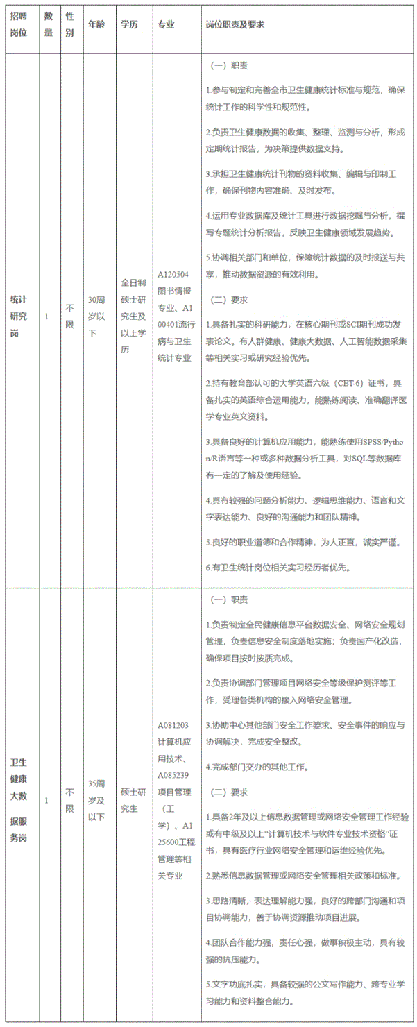 深圳市卫生健康发展研究和数据管理中心是深圳市卫生健康委员会直属公益一类事业单位,位于深圳市福田区香蜜湖街道安托山一路2号(侨香办公区)及深圳市福田区园岭五街8号(园岭办公区),中心主要职能为:负责全市卫生健康战略、健康政策与发展规划、人口和家庭发展的研究、咨询、指导;负责开展卫生健康政策评估标准、评估质量控制、评估方法和流程的研究与应用;承担卫生健康政策风险评估和监测评价的事务性工作;负责全市卫生健康数据平台和信息系统的建设、运维和安全保障工作;负责深圳电子处方中心的运营和管理工作;负责全市卫生健康规范和标准制定的技术性支撑工作,统筹推进全市医疗卫生机构数据统一归集、共享、分析、应用;负责全市医学文献检索服务、医学研究项目查新,收集和编印卫生健康刊物资料;负责开展全市卫生健康学术交流、对外合作和健康政策教育培训与推广;完成市卫生健康委交办的其他任务。因中心工作需要,现公开招聘聘用人员2名,具体事项如下: