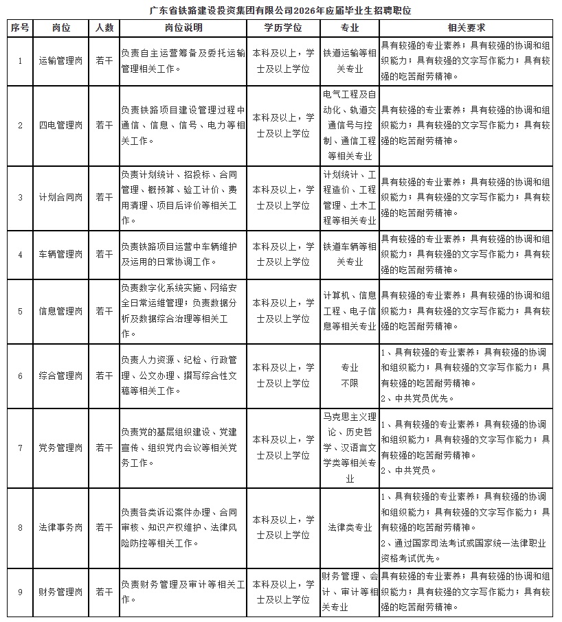 因集团发展需要,现诚聘运输类、造价类、综合类、法律类、财务类、信息类等专业人才,具体招聘岗位及要求详见附件:《广东省铁路建设投资集团有限公司2026届应届毕业生招聘职位》。
