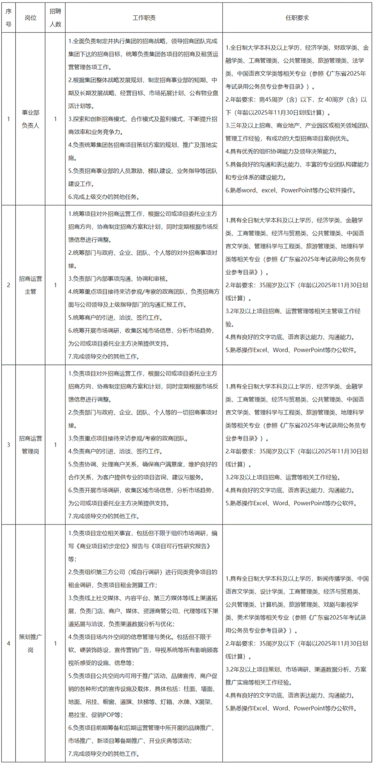 广东顺北集团有限公司(以下简称“顺北集团”)下设招商事业部。因工作需要,招商事业部公开招聘事业部负责人等岗位共四名。现将有关事项公告如下: