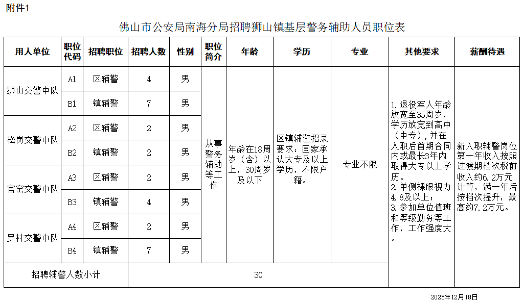 招聘岗位及条件标准详见《佛山市公安局南海分局招聘狮山镇基层警务辅助人员职位表》(附件1)。