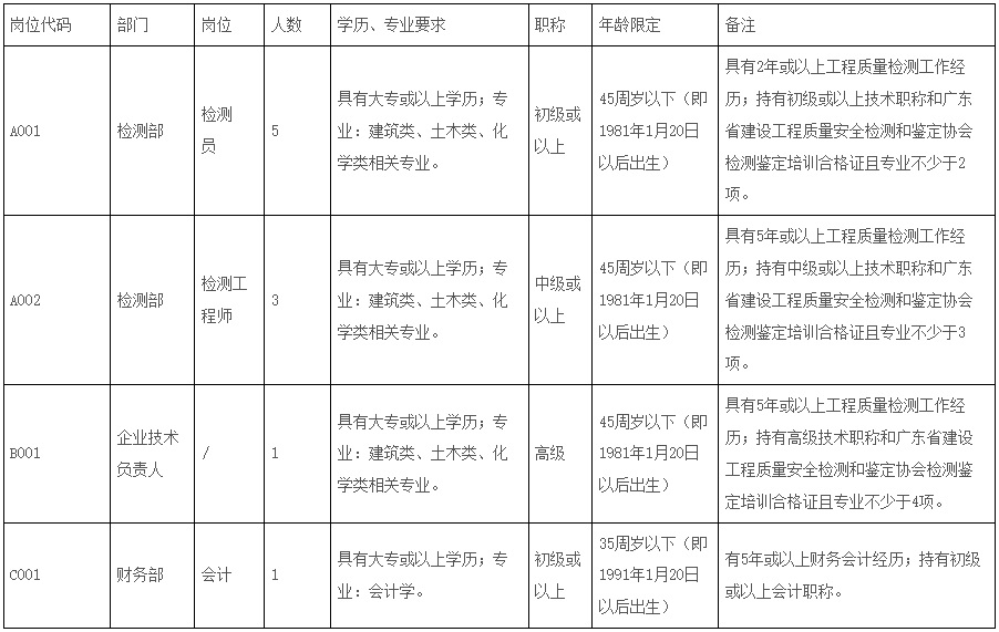 龙门县城乡建设工程质量检测有限公司公开招聘职工