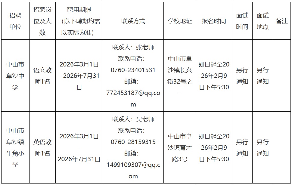 因教育事业发展和工作需要,镇属阜沙中学、牛角小学等两所公办学校现面向社会招聘非编教师2名。具体情况如下: