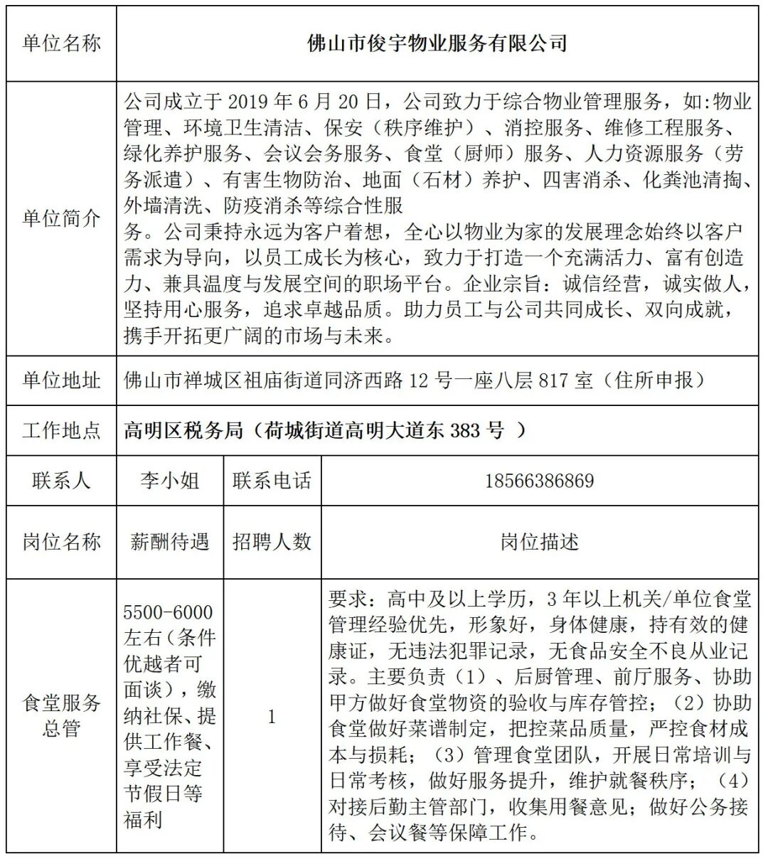 佛山市俊宇物业服务有限公司招聘