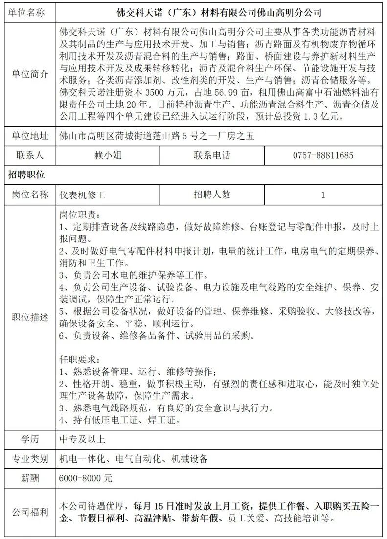 佛交科天诺(广东)材料有限公司佛山高明分公司招聘